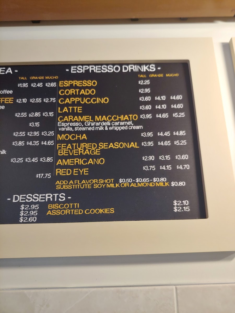 Espresso, ghirardelli caramel, vanilla, steamed milk, and whipped cream.